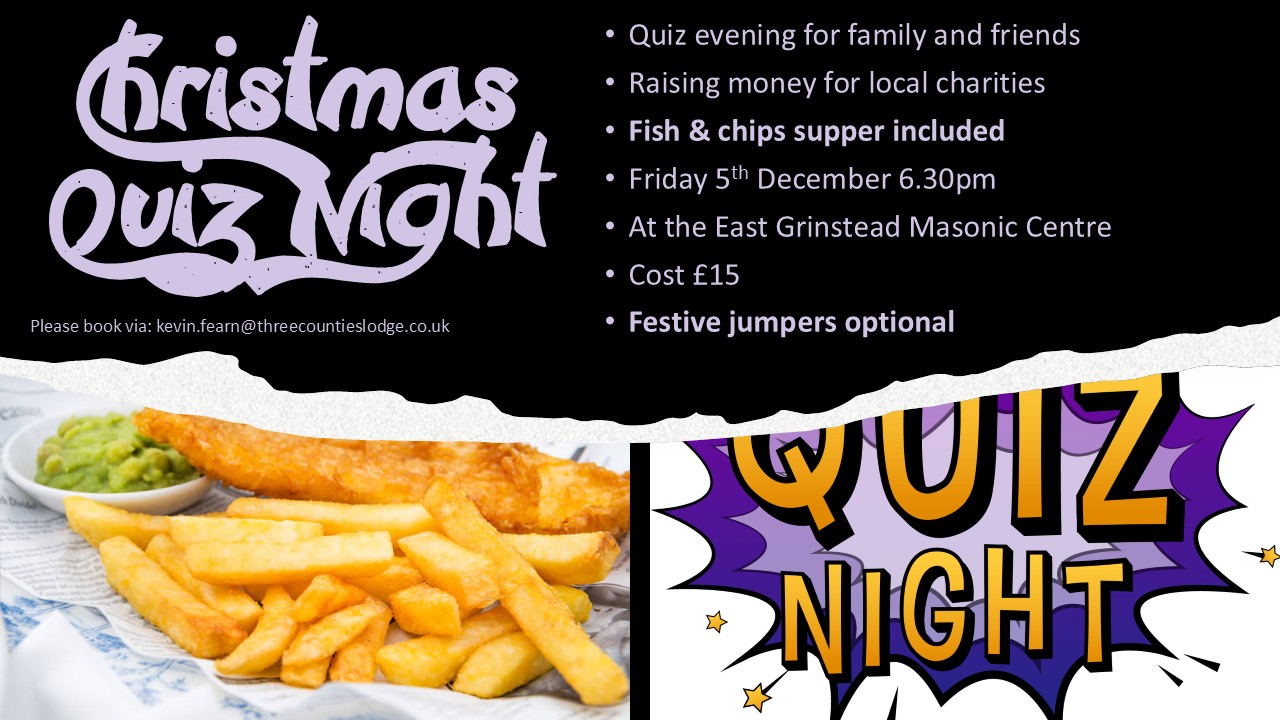 Quiz evening for family and friends - raising money for local charities. Cost £15. Fish & chips supper included. Festive jumpers optional!